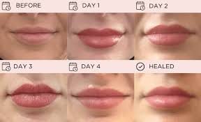 Permanent makeup lip healing takes about 5-10 days, with full color maturity at 6 weeks. Lips will appear very bright and swollen for 1-2 days, followed by dryness, chapping, and peeling around days 3-5. The color will fade by up to 50% during the healing process, making it look lighter or uneven (ghosting) before settling into its final shade.